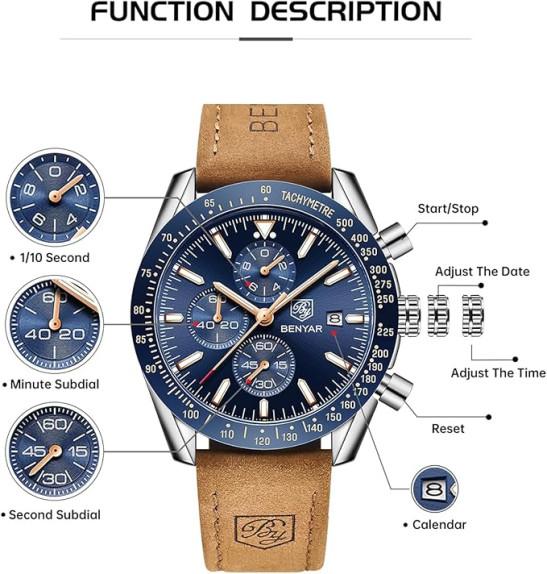 BY BENYAR Watch for Men Analog Quartz Chronograph Mens Watches 30M Waterproof Luminous Big Face Designer Dress Wrist Watches Business Work Sport Casual Fashion Watch Elegant Gift for Men
