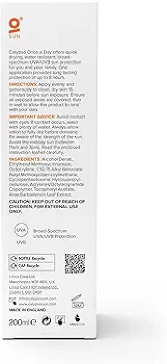 Calypso Once A Day Sun Protection Lotion SPF20 | 8 Hours Sun Protection | Non Greasy | Superior 4 Start UVA Rating - 200 ml CALC20L
