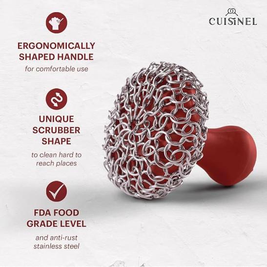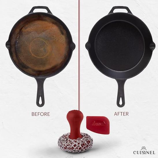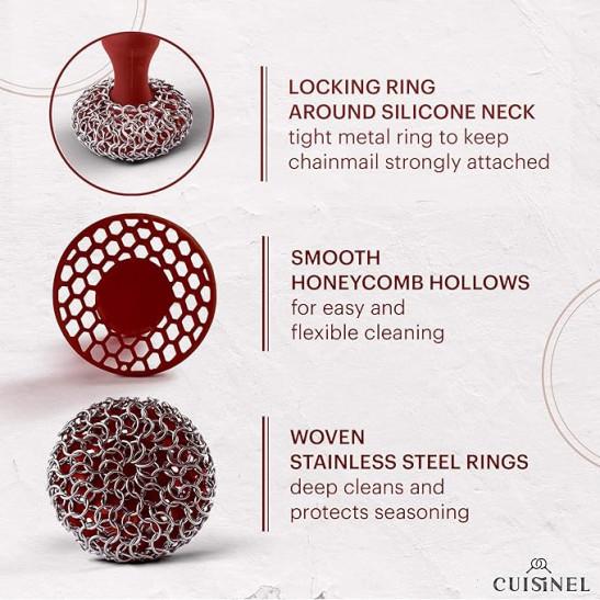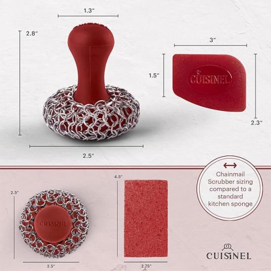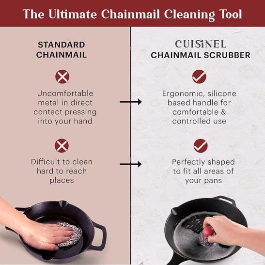 Cast Iron Chainmail Scrubber + Pan Scraper - Ergonomic Stainless and Silicone Cleaner for Pots and Skillets - Premium Food-Safe Design - Easy to Clean Dishwasher Safe Cookware Sponge Kitchen Accessory