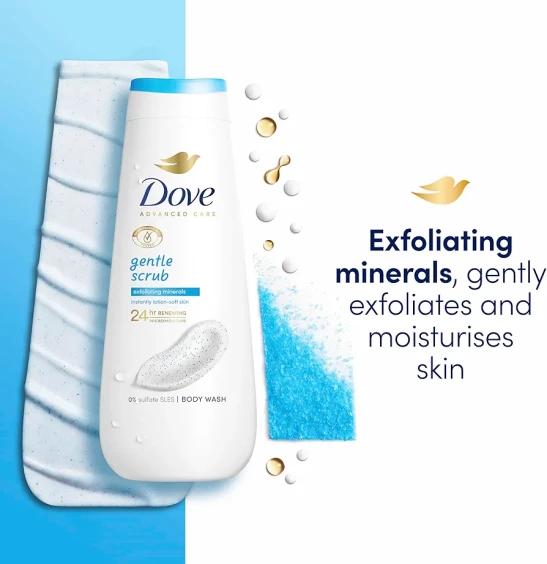 Dove Advanced Care Gentle Scrub Body Wash Body Cleanser shower gel with exfoliating minerals for instantly lotion-soft skin 6x 225 ml
