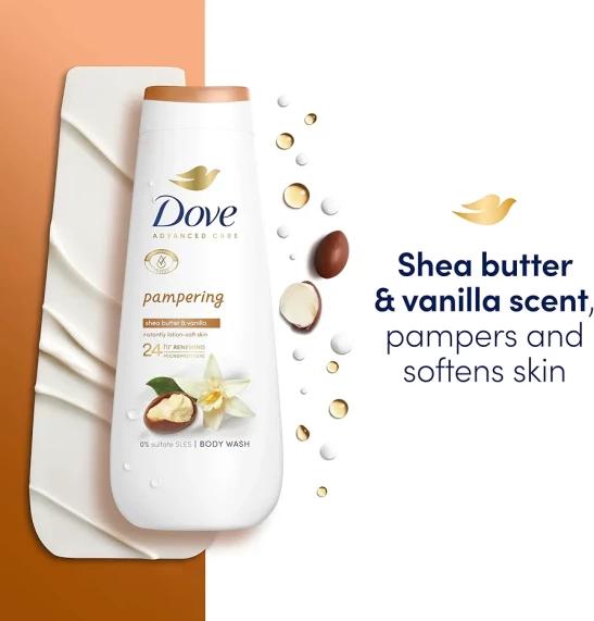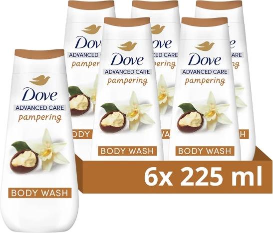 Dove Advanced Care Pampering Body Wash Body Cleanser shower gel with a shea butter & vanilla scent for instantly lotion-soft skin 6x 225 ml