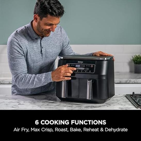 Dual Zone Digital Air Fryer, 2 Drawers, 7.6L, 6-in-1, Uses No Oil, Air Fry, Max Crisp, Roast, Bake, Reheat, Dehydrate, Cooks 4-6 Portions, Non-Stick, Dishwasher Safe Baskets, Black AF300UK