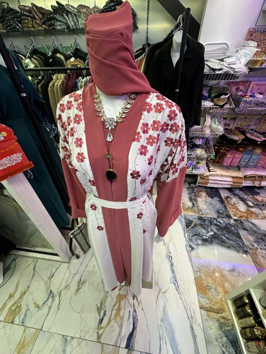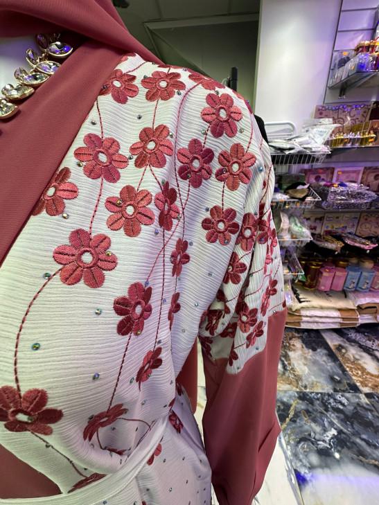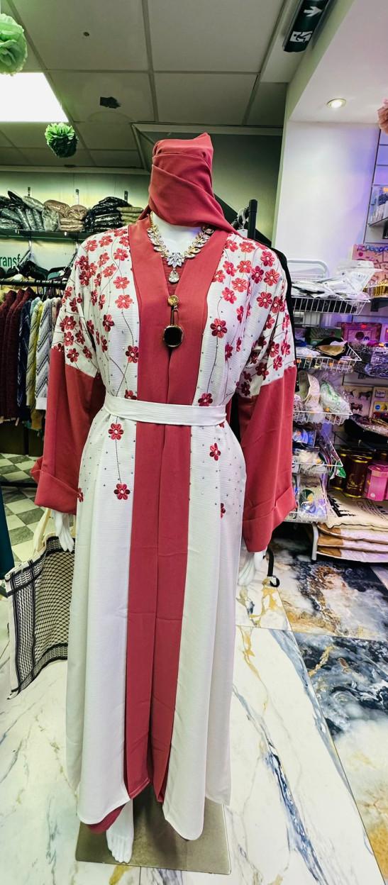 Embroidered Open Abaya Rose Gold (56) 3-Piece Set with Inner Dress & Matching Hijab
