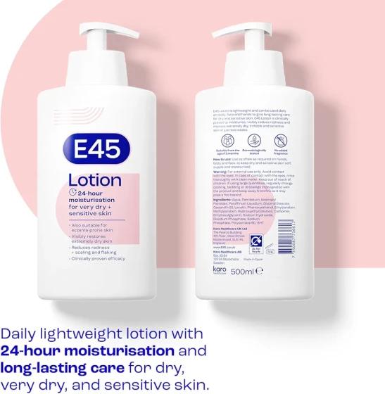 E45 Moisturising Lotion 500 ml for Dry & Sensitive Skin - Long-Lasting Hydration Protect from Dryness, Reduce Redness - Dermatological Body Moisturiser Lotion - Body Lotion - Daily Moisturiser