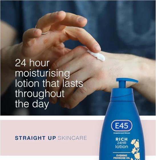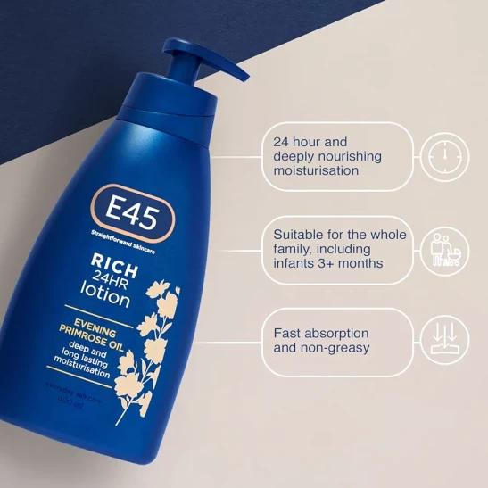 E45 Rich Skin Lotion 400 ml – E45 Moisturising Lotion with Evening Primrose Oil – Lightweight Body Lotion for Dry and Sensitive Skin – Long-Lasting Moisturisation for Soft and Supple Skin (Pack of 2)