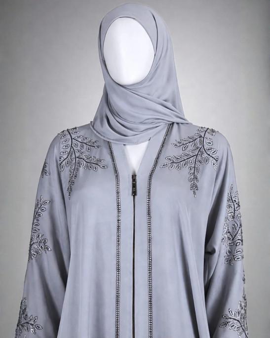 Elegant Ice Blue Embellished Abaya with Crystal Leaf Detailing Gown comes with belts and scarf (52)