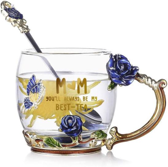 evecase Mothers Day Gifts Butterfly Flower Glass Coffee Mugs Tea Cup with Steel Spoon, Mum Gifts for Women Wife Friends Christmas Birthday Mothers Valentines Day (Mum)