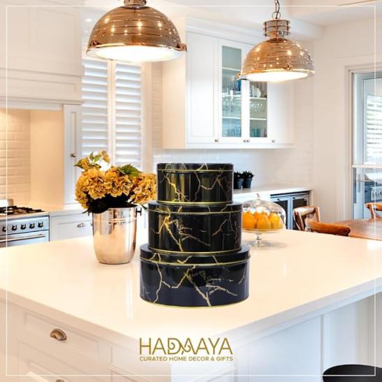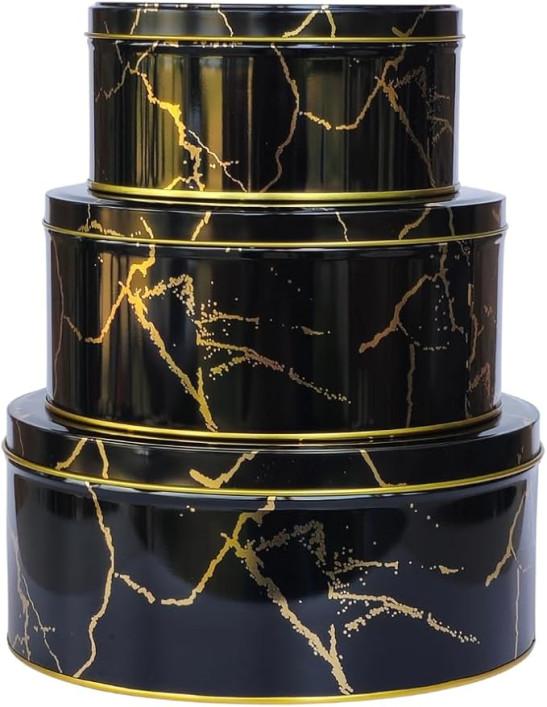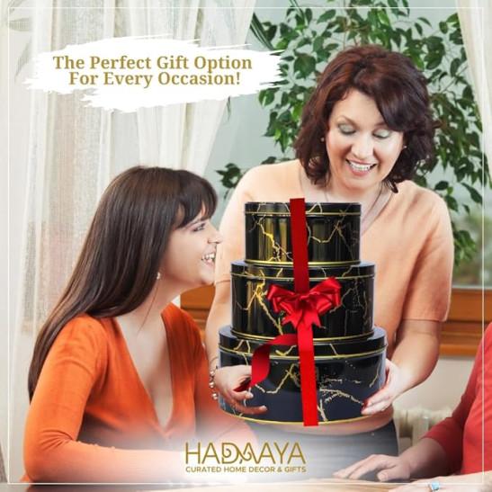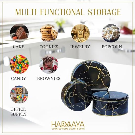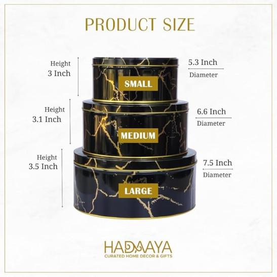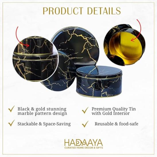 hadaaya Pack of 3 Round Metal Nesting Tins – Stackable Storage Containers with Lids for Cookies, Candy, Snacks, Crafts & Kitchen Storage – Black & Gold Gift Tin Box for Women/Mother’s Day