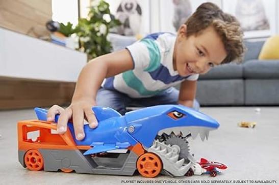 Hot Wheels Shark Chomp Transporter Playset with One 1:64 Scale Car for Kids 4 to 8 Years Old, Shark Bite Hauler Picks Up Cars in Its Jaws & Stores Up to Five in its Belly - GVG36