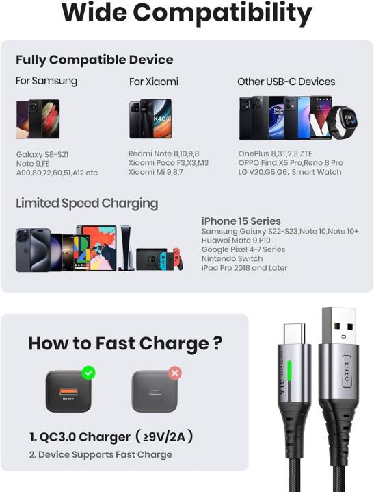 INIU USB C Charger Cable 2m 3.1A Type C Cable Fast Charging, Braided USB A to USB-C Phone Charger Cable USBC for iPhone 15 Pro Samsung Galaxy S22/S21/S20/S9 Huawei P9 Pixel 7/6 iPad Switch PS5 etc.