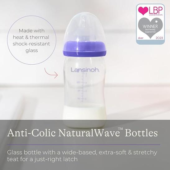 Lansinoh Glass Baby Bottle + NaturalWave™ Medium Flow Teat with Anti Colic Air Vent - 160ml