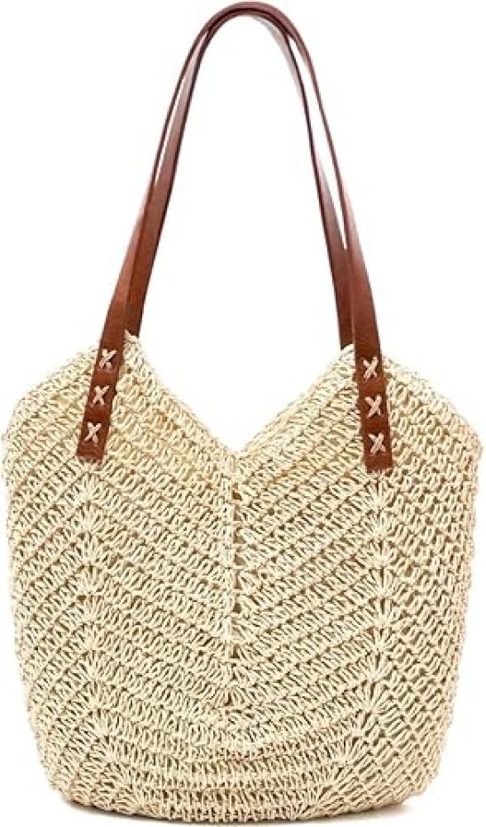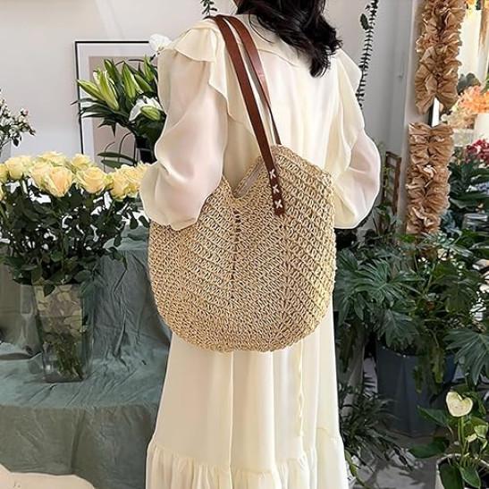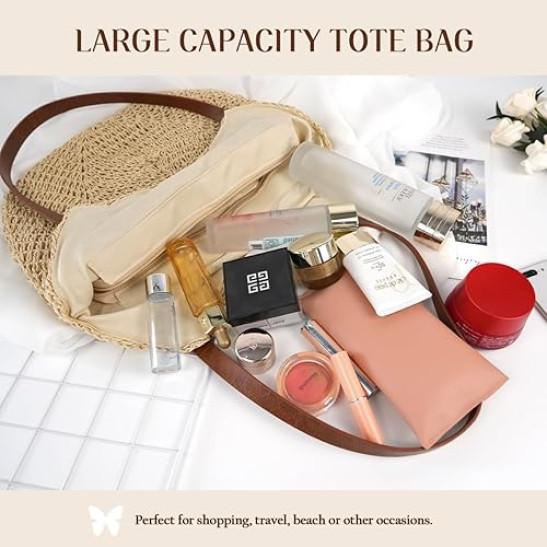 MAMUNU Straw Beach Bag for Women, Summer Straw Tote Bag Handbag with Zip Leather Handles, Retro Handmade Boho Casual Woven Travel Holiday Shoulder Bags for Beach Vacation Outdoor Shopping Daily Use