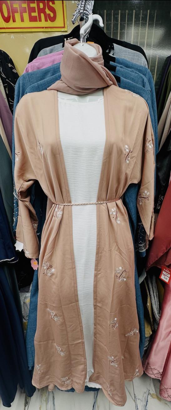 Embroidered Open Abaya Rose Gold (50) 3-Piece Set with Inner Dress & Matching Hijab