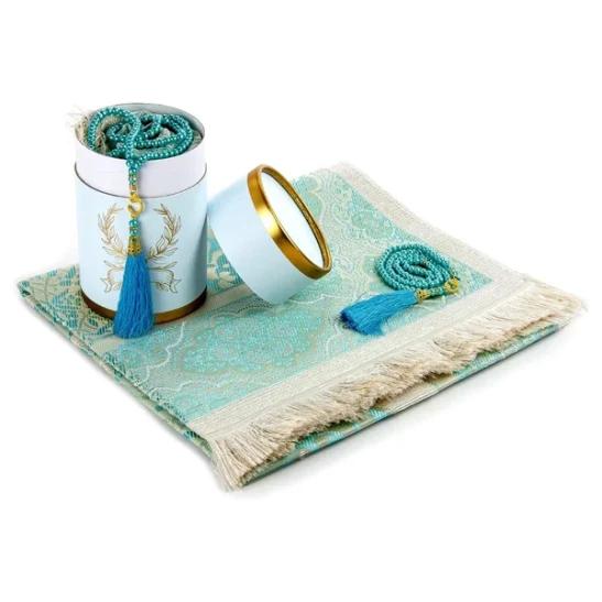 Muslim Prayer Rug and Prayer Beads with Elegant Cylinder Gift Box , Janamaz, Sajadah, Soft Islamic Prayer Rug, Islamic Gifts SeT, Prayer Carpet Mat, Taffeta Fabric