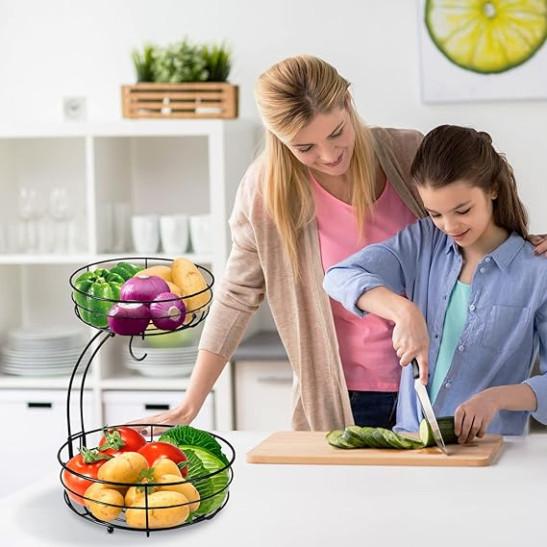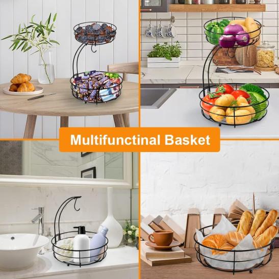 Mutool Fruit Basket, 2-Tier Fruit Bowl with Banana Hanger, Kitchen Countertop Rack, Metal Bowls Perfect for Holding Fruit, Vegetables, Snacks, Cupcakes (Black)