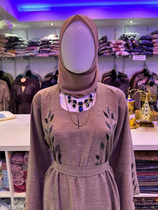 New Arrival Taupe Elegance Embroidered Abaya Beige(54) Gown with Delicate Leaf Embroidery Stylish Belt & Matching Scarf for All Seasons