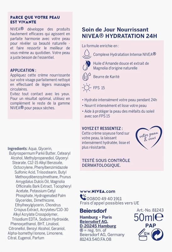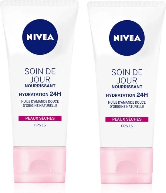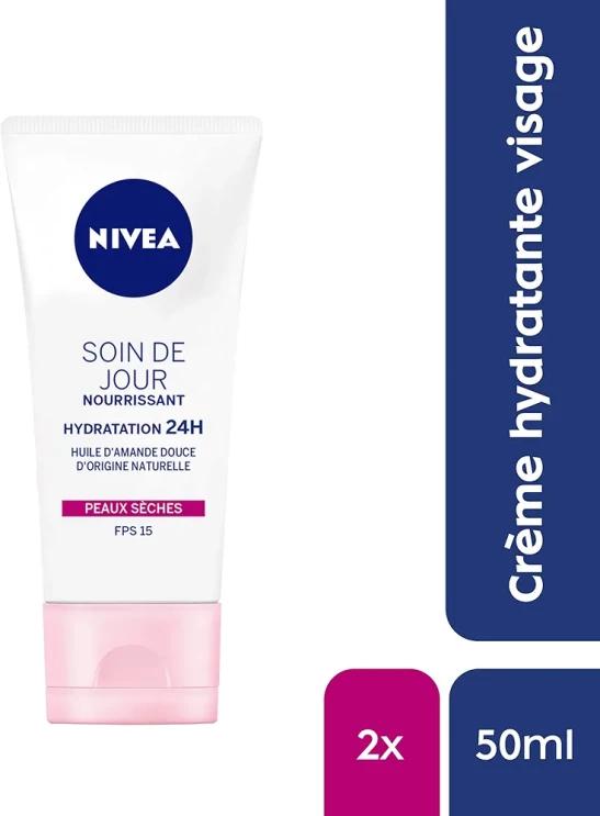 NIVEA 24H Moisturising Nourishing Day Cream SPF 15 (2 x 50 ml), Face Moisturiser Enriched with Shea Butter, Women's Face Care for Dry Skin