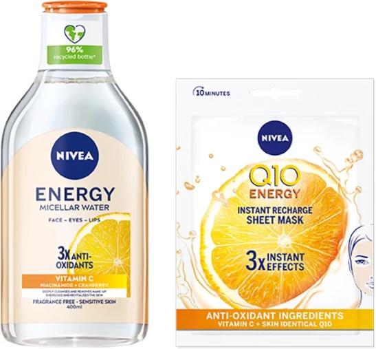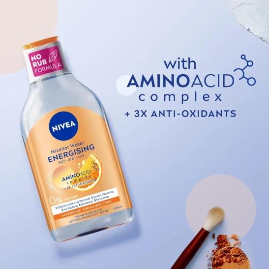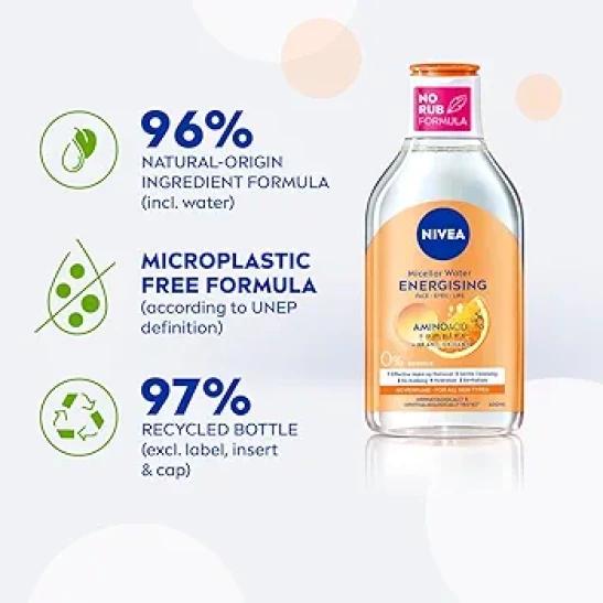 NIVEA Micellar Water Energising (400ml), Micellar Cleansing Water with Amino Acid Complex + Vitamin C, Vitamin B3 and Cranberry Extract, Effective Make-Up Remover