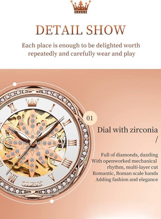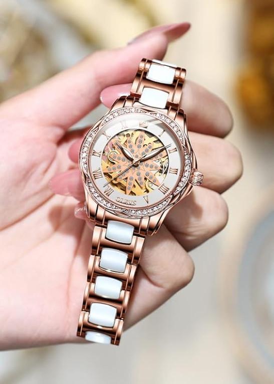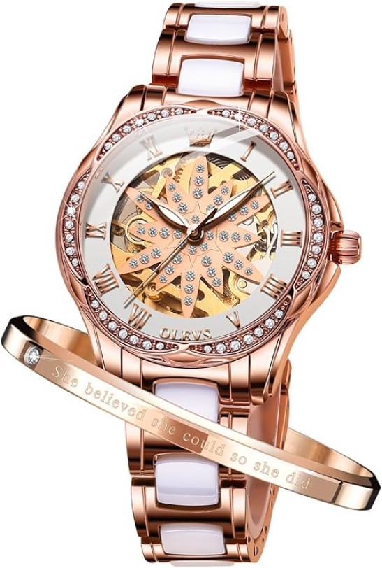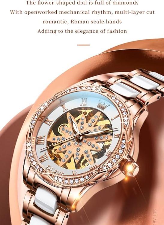 OLEVS Women's Rose Gold Automatic Watches Skeleton Mechanical Self Winding Ladies Elegant Luxury Dress Butterfly Diamond White Ceramic Band Watch Gift