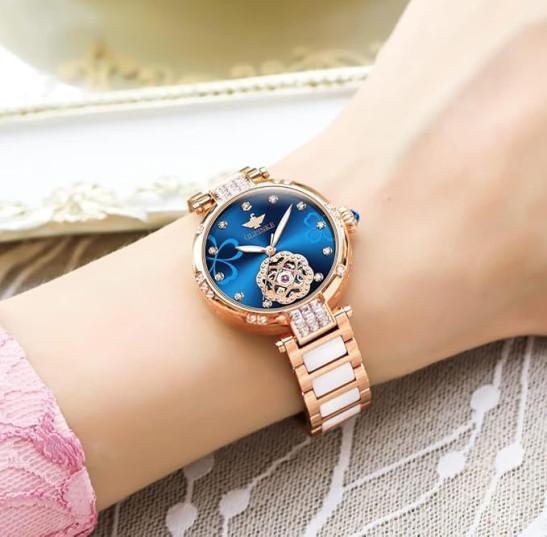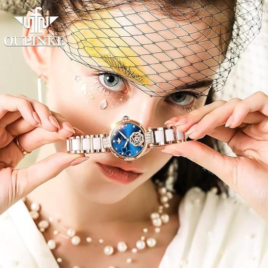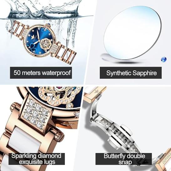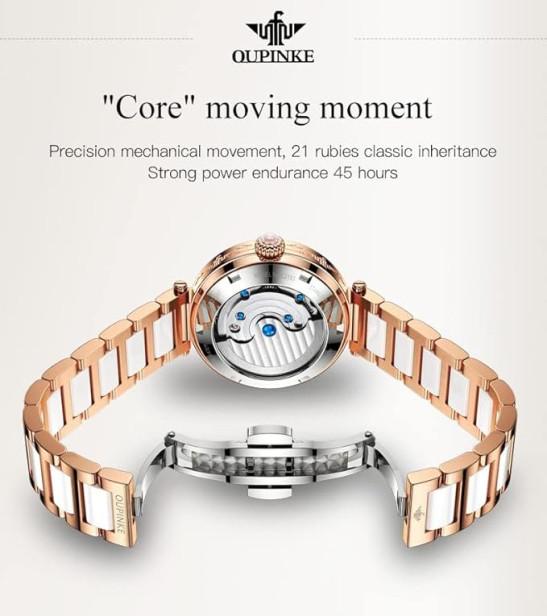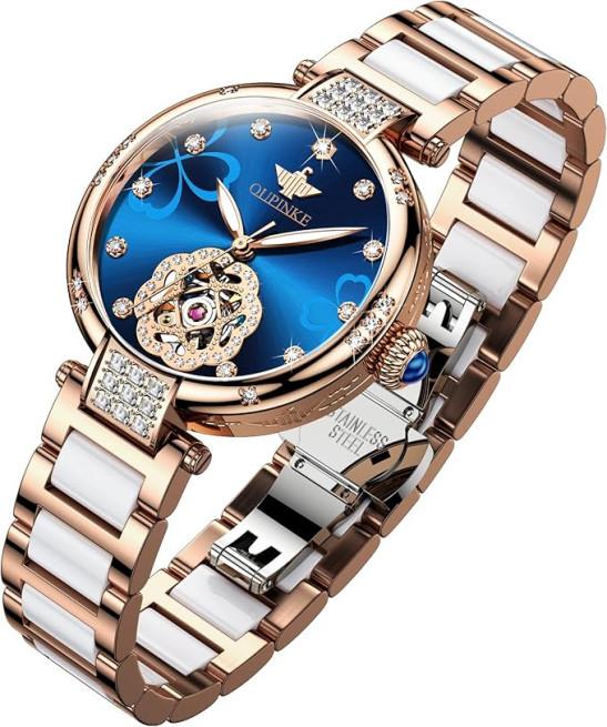 OUPINKE Womens Automatic Watches Rose Gold Ceramic Diamond Elegant Dress Wrist Watch Skeleton Engrave Mechanical Self Winding Waterproof Luminous