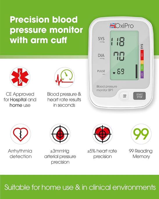 OxiPro BP1 Blood Pressure Monitors - CE Certified - MHRA Registered - UK Approved Blood Pressure Machine - BP Monitor for Home - Small to Large Cuff Blood Pressure Monitor - Certified Medical Device
