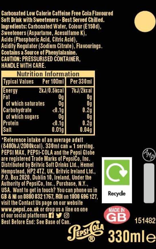 Pepsi Max No Caffeine & No Sugar Soft Drinks, 8 x 330ml