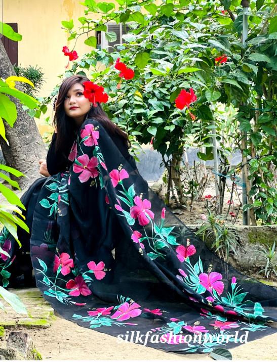 Rajshahi Muslin Silk Hand Paint Saree With Attached Unstitched Blouse Piece