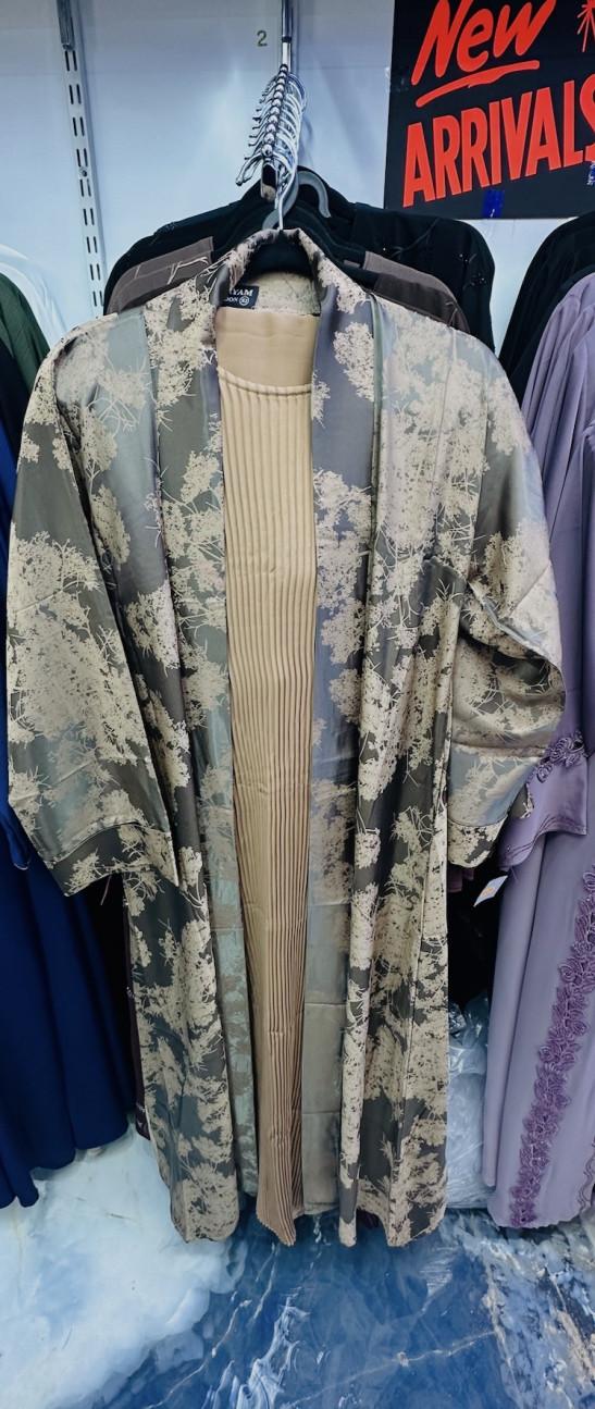 Elegant Sage & Champagne Floral Jacquard Abaya Set Champagne Gold(56) – 3-Piece Pleated Inner & Kimono Wrap