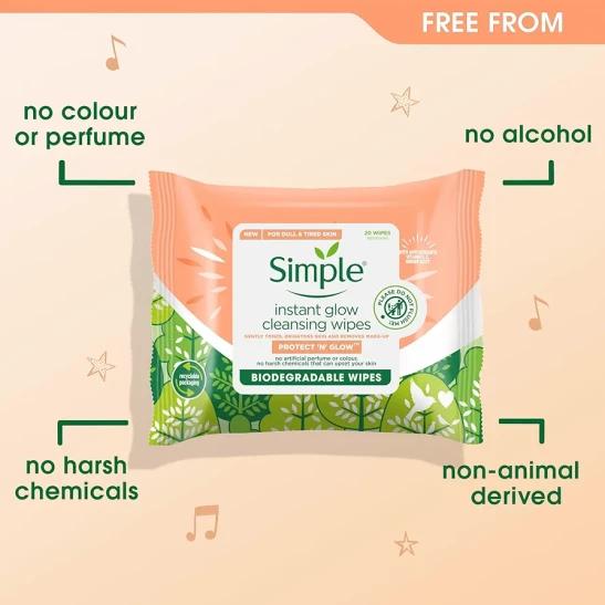 Simple Protect ‘N’ Glow Instant Glow Biodegradable Wipes dermatologically tested for sensitive skin 20 wipes