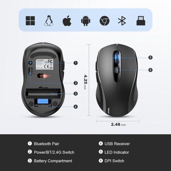 TECKNET Bluetooth Mouse, 4000 DPI Wireless Optical Computer Mice Bluetooth 3.0/5.0 and 2.4GHz Tri-Connectivity Mouse,18 Months Long Battery Life Cordless USB Mouse for Laptop PC Office Home Work