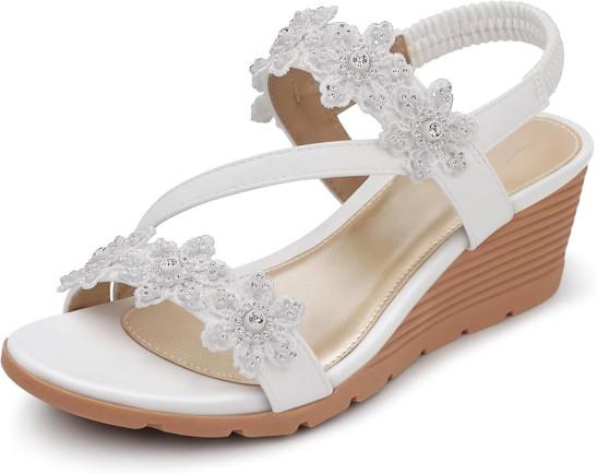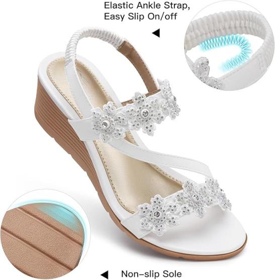 TEMOFON Wedge Sandals for Women Elastic Ankle Strap Bohemian Sandals Open Toe Flower Rhinestone Shoes
