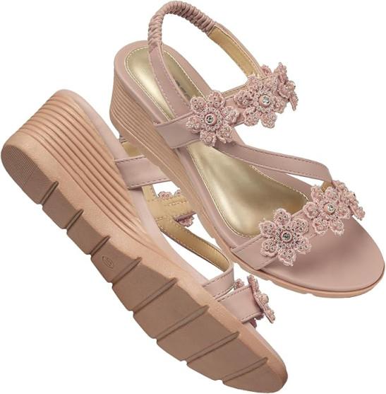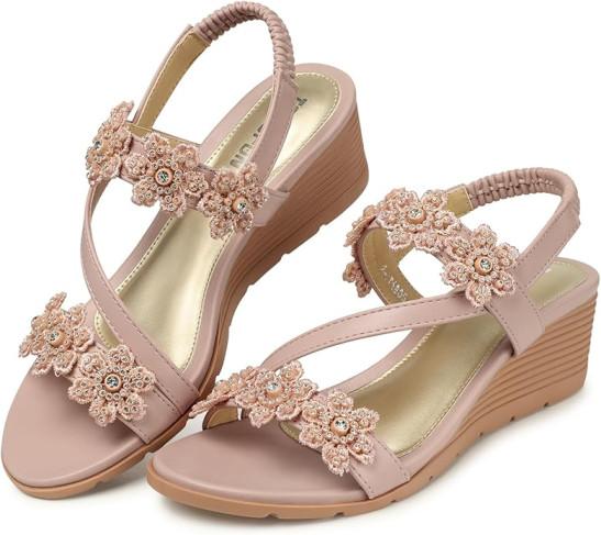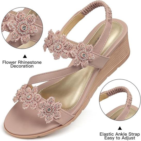 TEMOFON Wedge Sandals for Women Elastic Ankle Strap Bohemian Sandals Open Toe Flower Rhinestone Shoes
