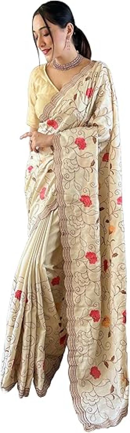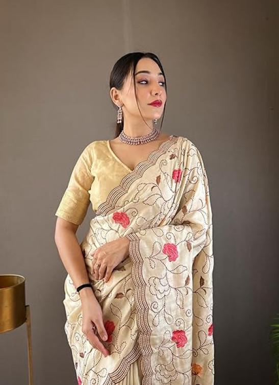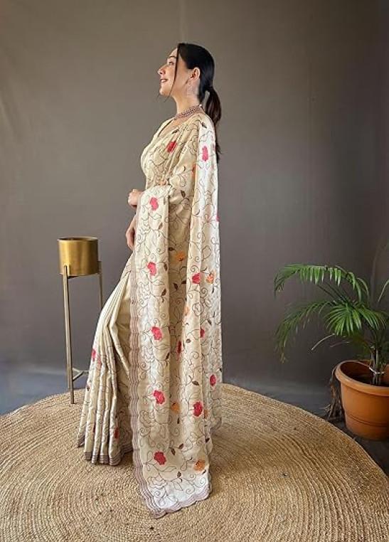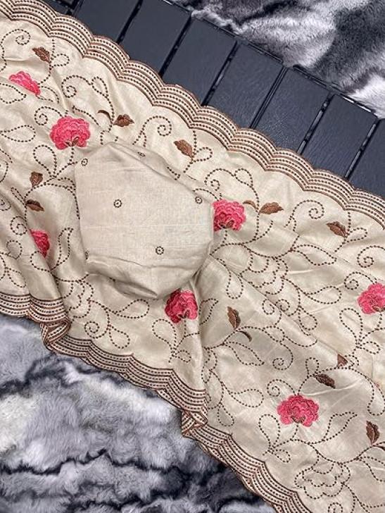 Tussar silk sarees with embroidery, floral design and cutwork on the border with unstitched blouse