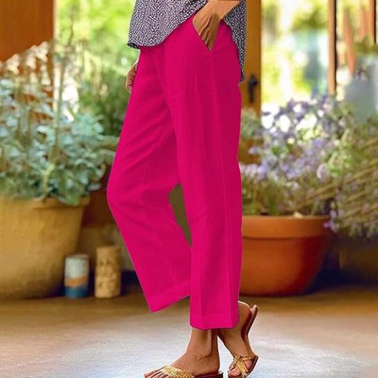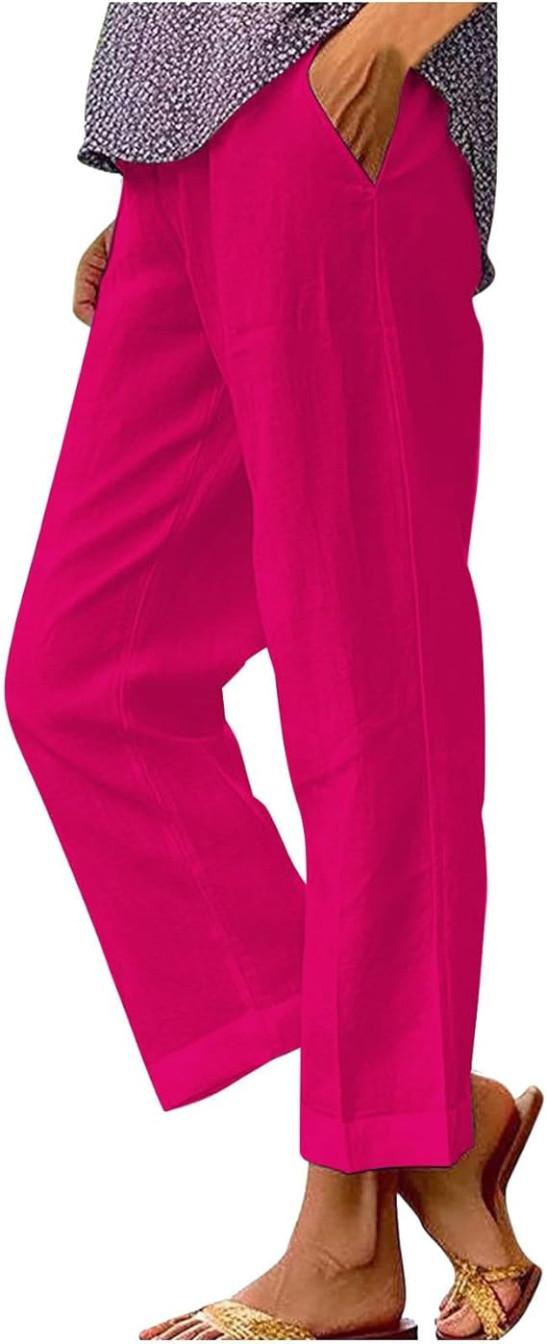 Women Solid Straight Solid Elastic Pants Long Drawstring Linen Women Waist Cotton Casual Pants Leggings with Pockets for Women Plus Size