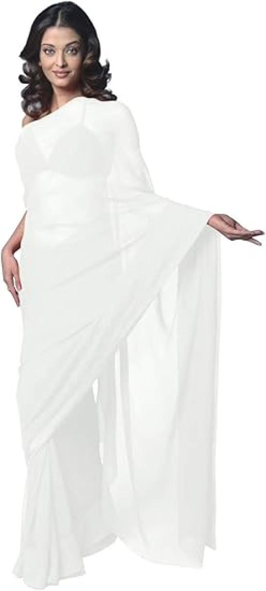 Women's Bollywood Chiffon Plain Sari Festival Uniform Saree Wrap Fabric Unstitched Blouse Piece Party Wear, White, One Size