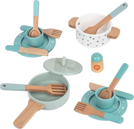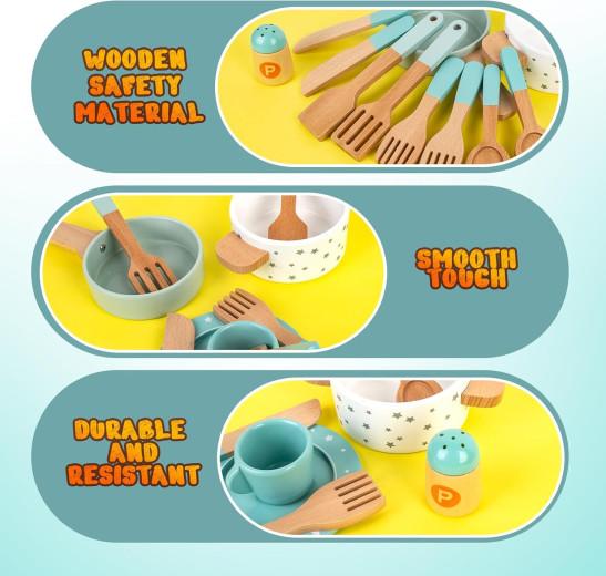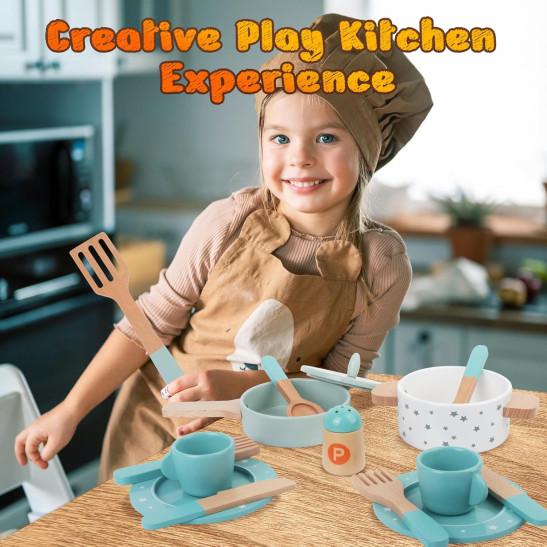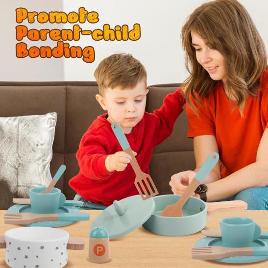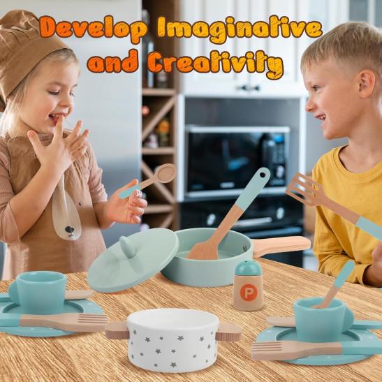 Wooden Toddler Toy Kitchen Pots and Pans, Toy Kitchen Accessories, Role Play Cookware Set, Pretend Play Cooking Simulation Educational Toys for Boys and Girls 3 4 5 6 7 8 Year Olds