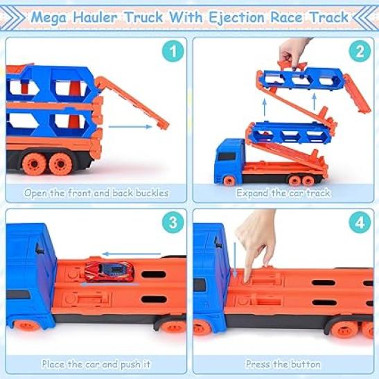 Xoolkly Transport Truck Toy Cars for Boys, Portable Race Track Truck Toy Car with 12 Race Cars, Folding Storage 2 Ejection Race Track, Carrier Truck Toys Set for Boys Girls Aged 3 4 5 6, Blue